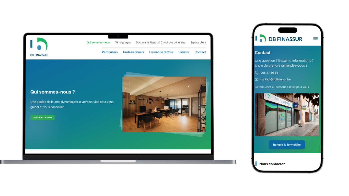 Grâce à cette optimisation, les utilisateurs peuvent parcourir le site, découvrir les assurances ou contacter le bureau DB Finassur en toute simplicité, où qu’ils soient.